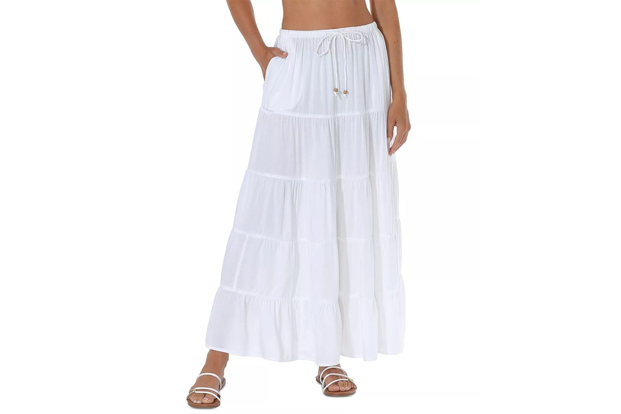 Raviya Draw-waisted Tiered Maxi Skirt is a versatile piece that works as a beach cover-up or a full-day outfit. Priced at $36 (originally $48), it has a drawstring waist for comfort and beaded details that add a beachy touch.